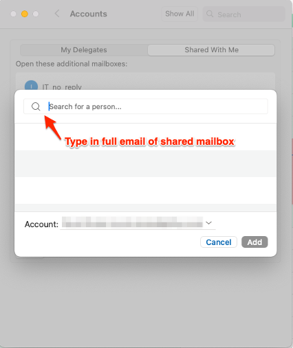 a. A search window will appear. Type the name or full email address of the shared mailbox (e.g., "team@planetcsc.com"). Select it from the results, then click Add.