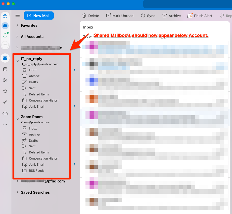 12. The shared mailbox should now appear in the left sidebar (Folder pane) under your main account or in a "Shared" section. If it doesn't appear immediately, quit and reopen Outlook, or click the Sync icon in the top ribbon.