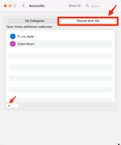 a. In the Delegation and Sharing window, click the Shared With Me tab. Then, click the + (plus) icon, at the bottom left or top left of the tab.
